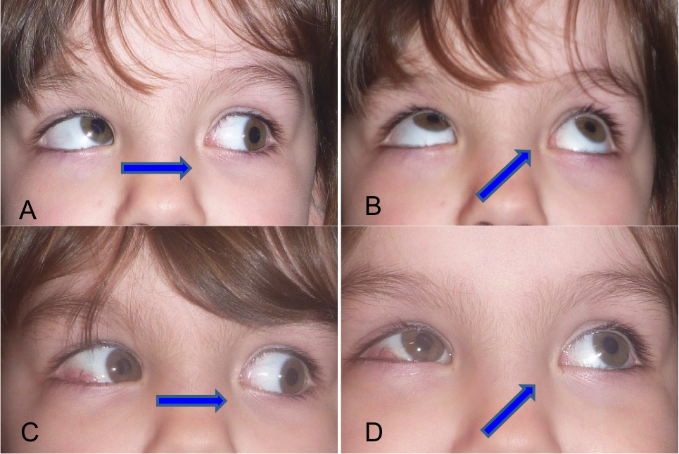 Fotos preoperatorias (arriba) y postoperatorias de un caso con hiperacción del músculo oblícuo inferior. Las flechas azules indican hacía donde dirige el niño la mirada.