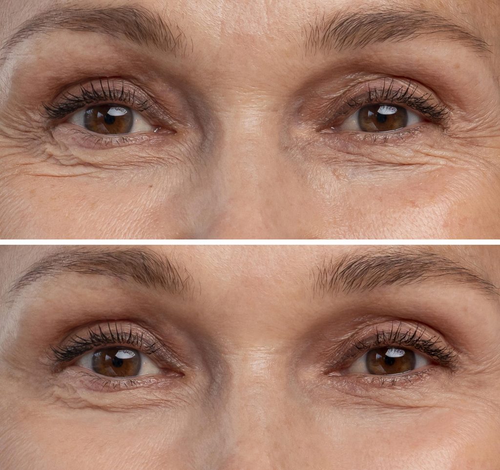 Antes (arriba) y después (abajo) de la inyección de Botox en las patas de gallo.